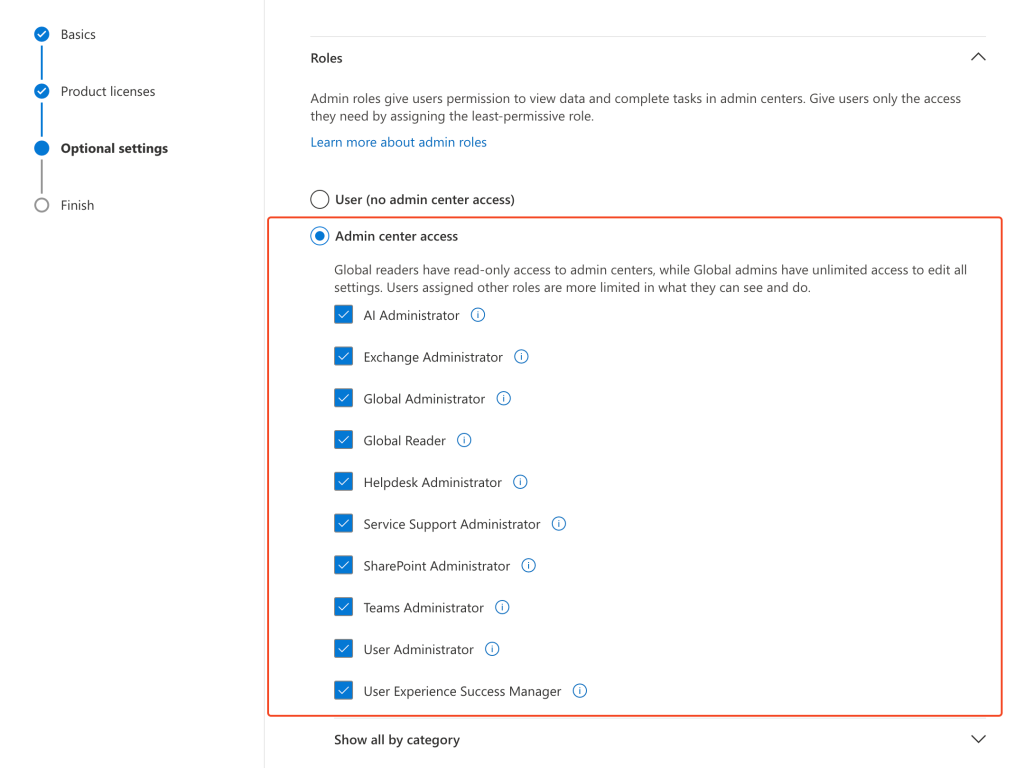 Select Admin center access, then check all available admin privileges in the list. Once all privileges are selected, click [Next].