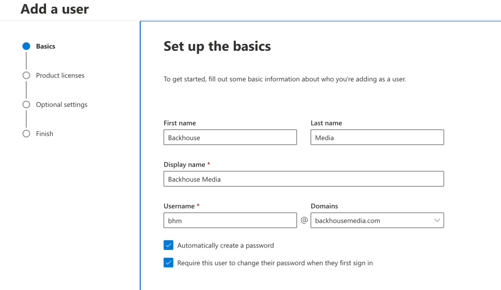 On the Add a user: Set up the basics page, enter the following information exactly as shown: